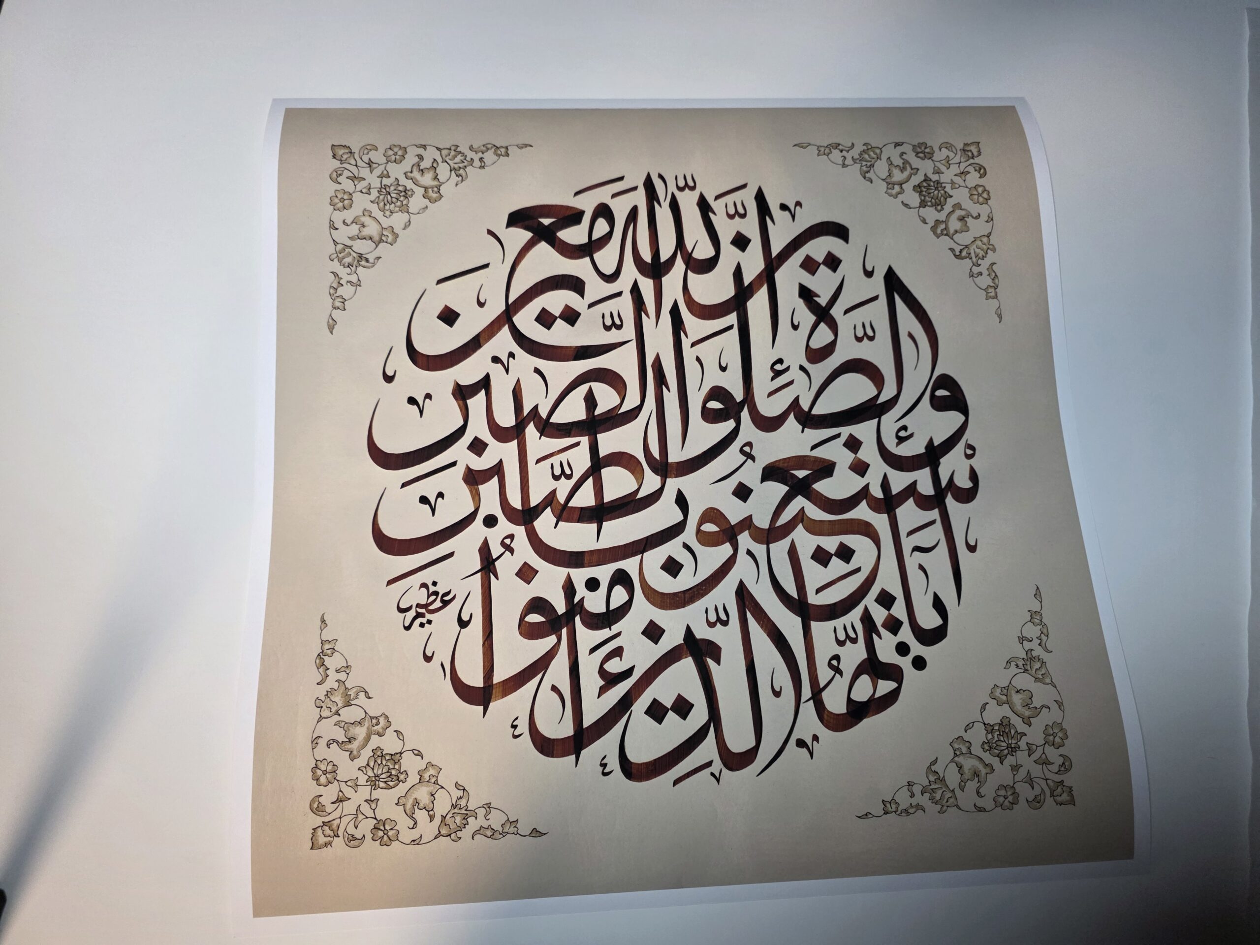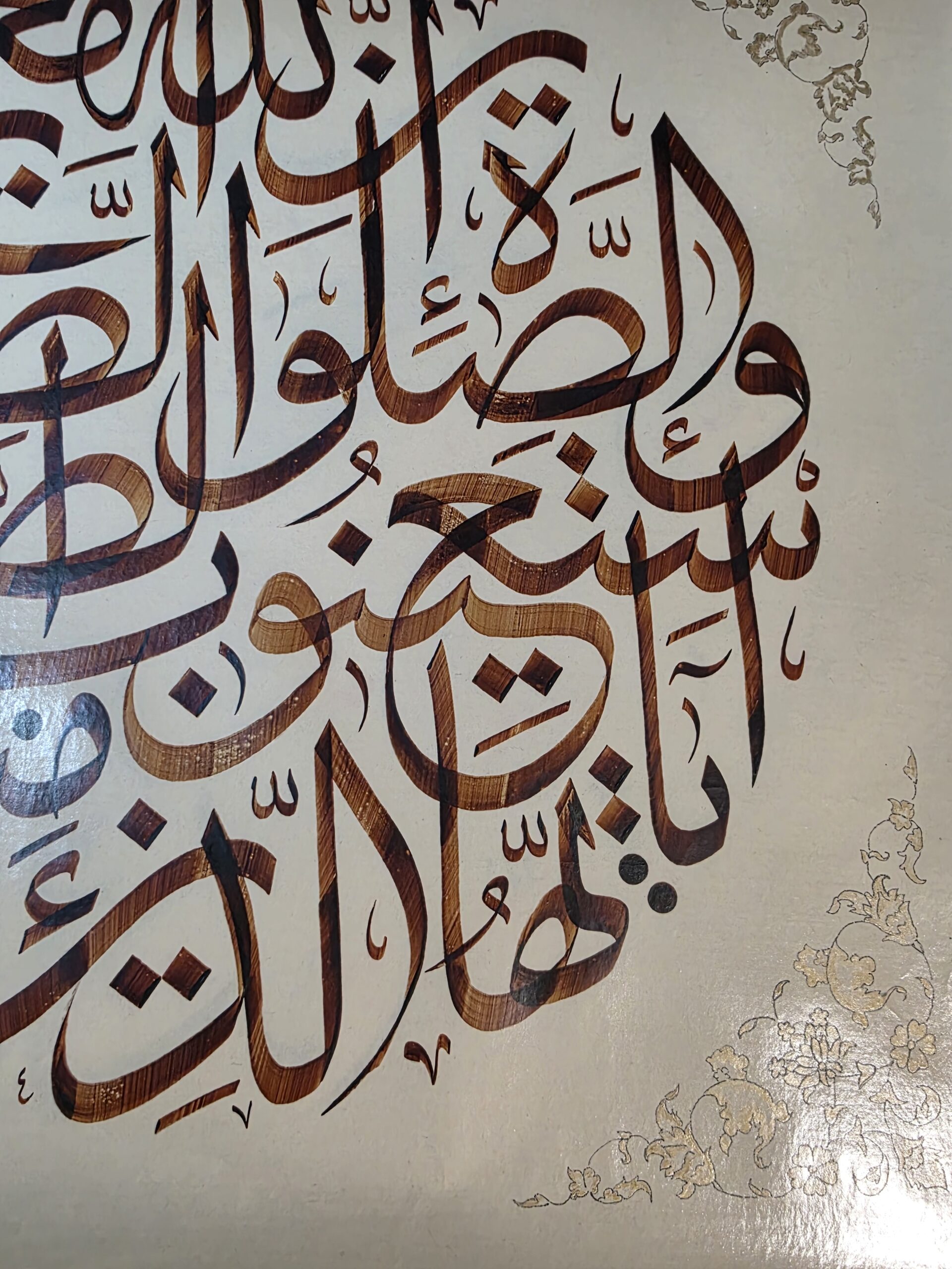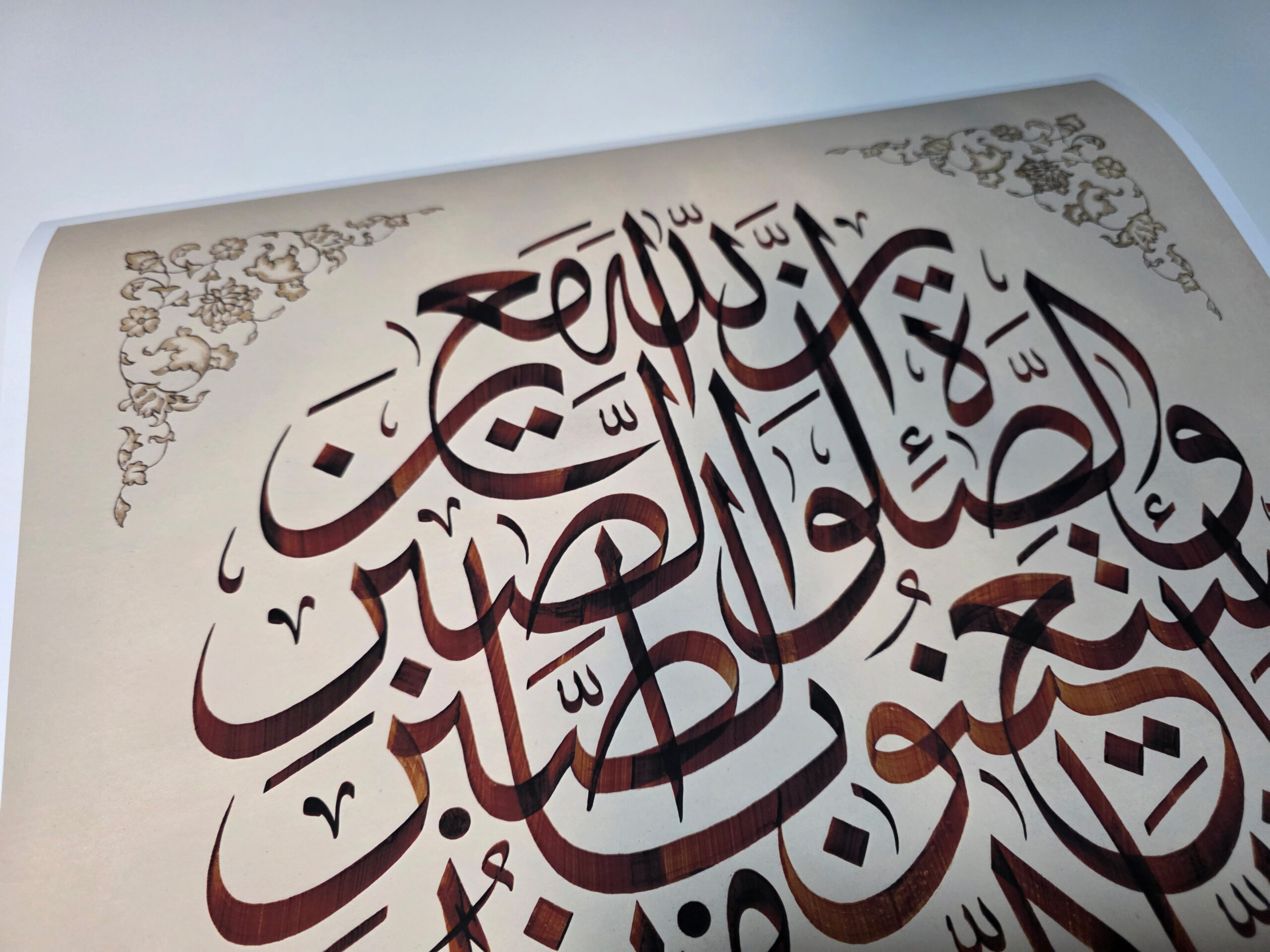 A powerful verse, original design by Azim Rehmat Din, completed in 2025. This original design is read from the bottom up, with “Allah”, God, placed at the top centre. Completed in brown ink, on traditional calligraphy paper, and ornamented with 22 carat gold.