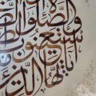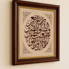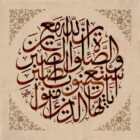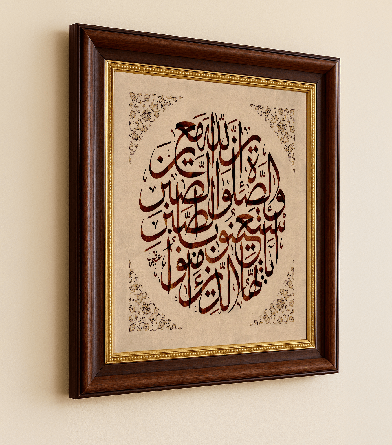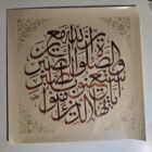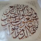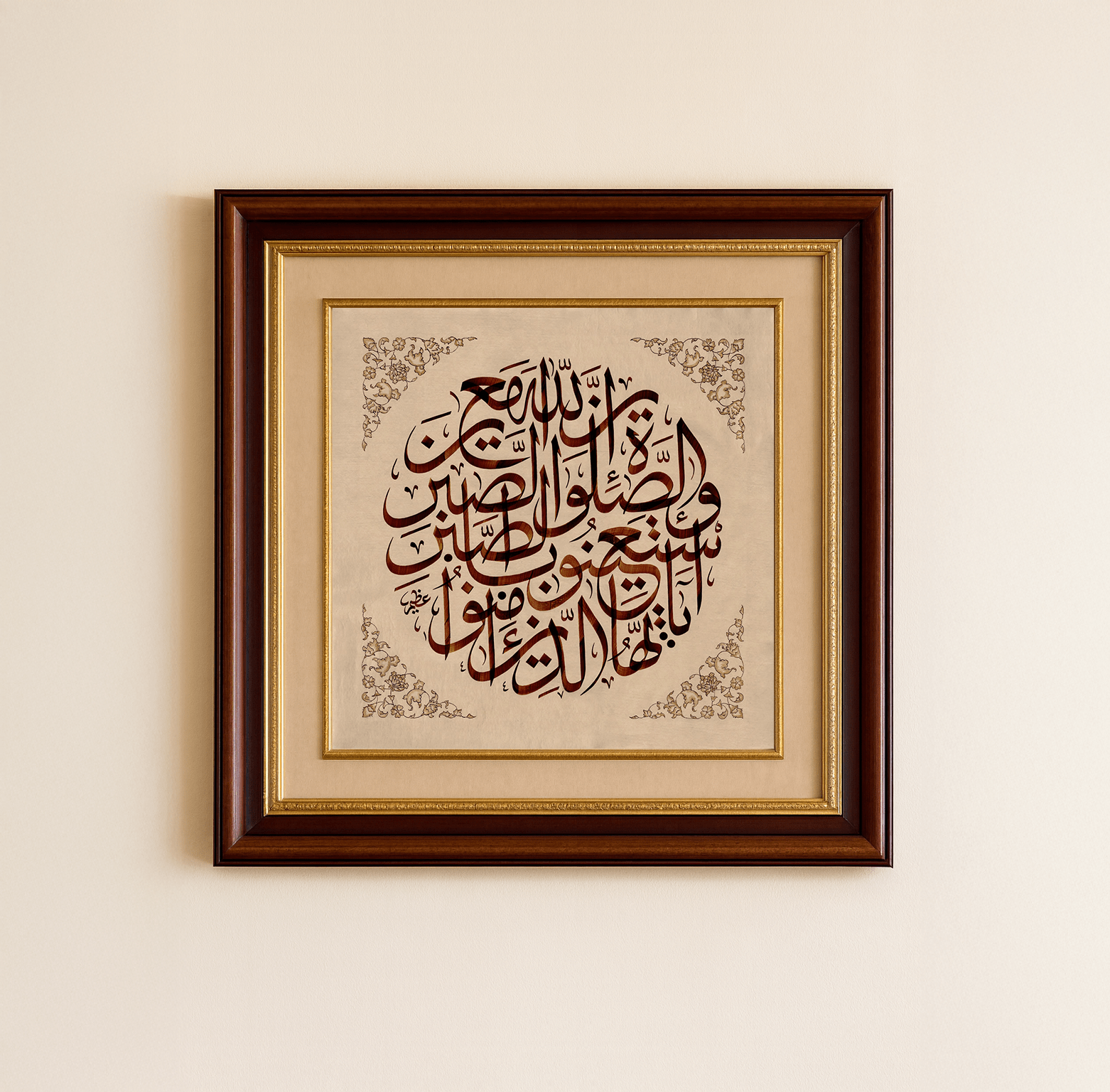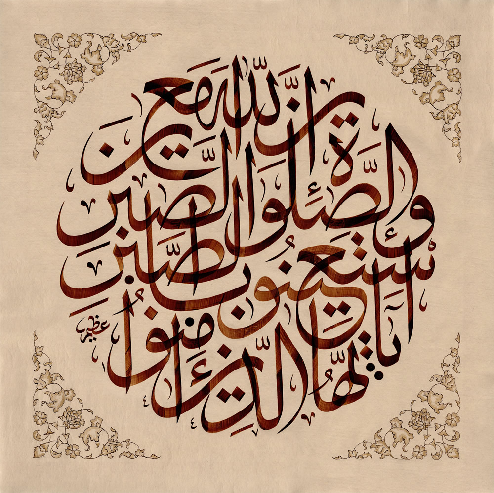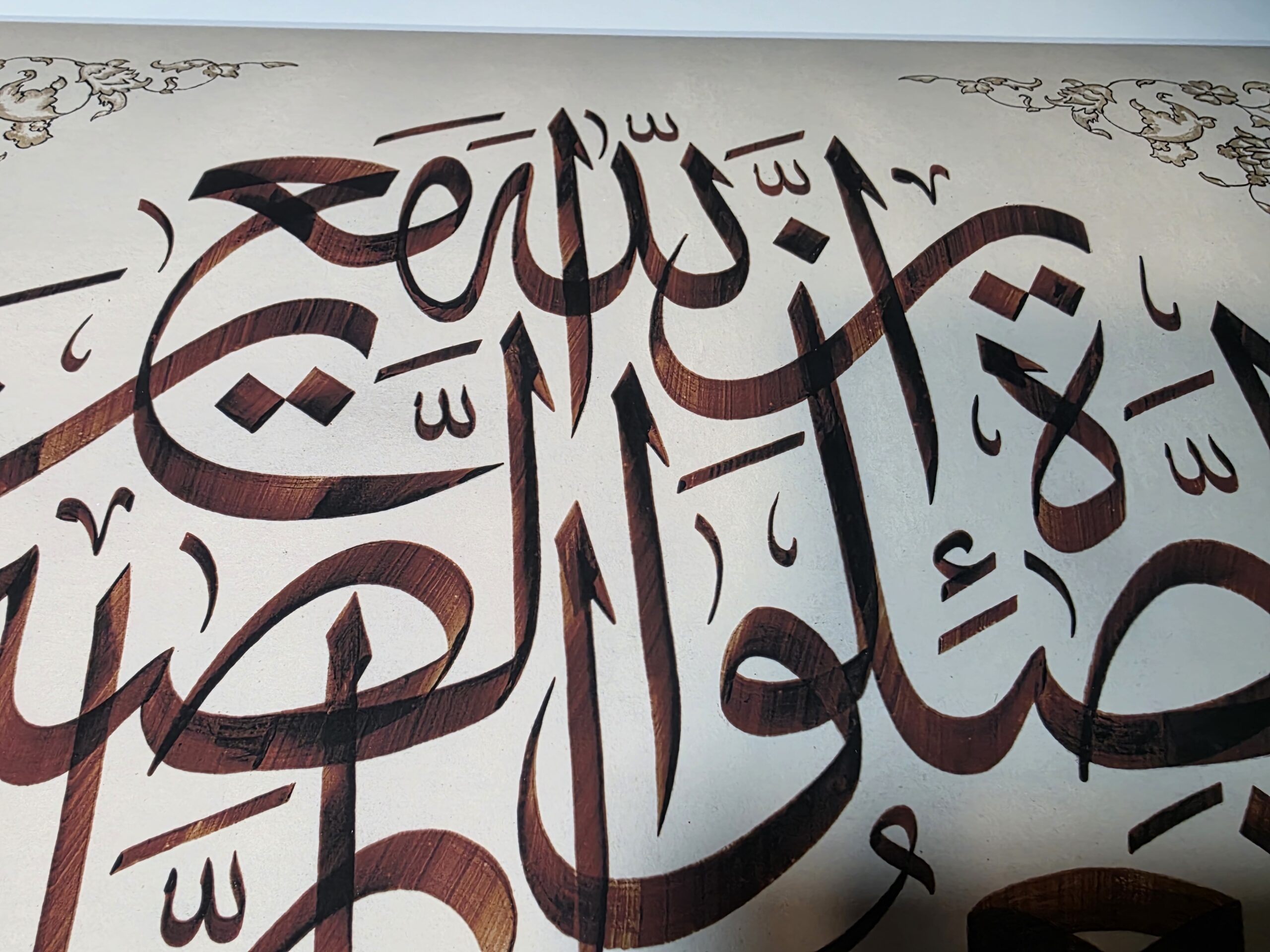 A powerful verse, original design by Azim Rehmat Din, completed in 2025. This original design is read from the bottom up, with “Allah”, God, placed at the top centre. Completed in brown ink, on traditional calligraphy paper, and ornamented with 22 carat gold.